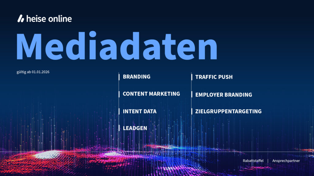 Interesse an den neuen und vielfältigen Werbemöglichkeiten bei heise online? Als eine der führenden IT/Tech-Webseite verhelfen wir deiner Marke zu starker Sichtbarkeit in zielgruppenrelevanten Umfeldern.