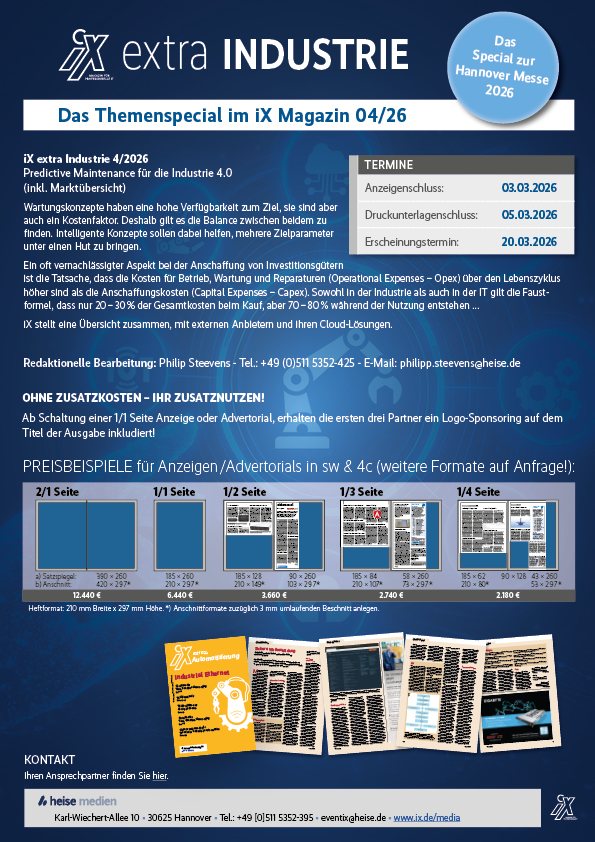 Das iX extra Themenspecial erscheint siebenmal jährlich als Themenstrecke zu den Schwerpunkten Industrie, Storage, Hosting, Cloud-Computing und Security.