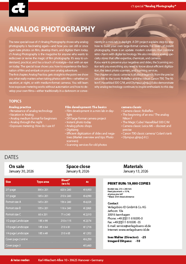 This new special issue shows why analog photography is fascinating again—and how you can still or once again take photos on film, develop them, and digitize them today. c’t Analog Photography is the magazine for anyone who wants to rediscover or revive the magic of film photography.