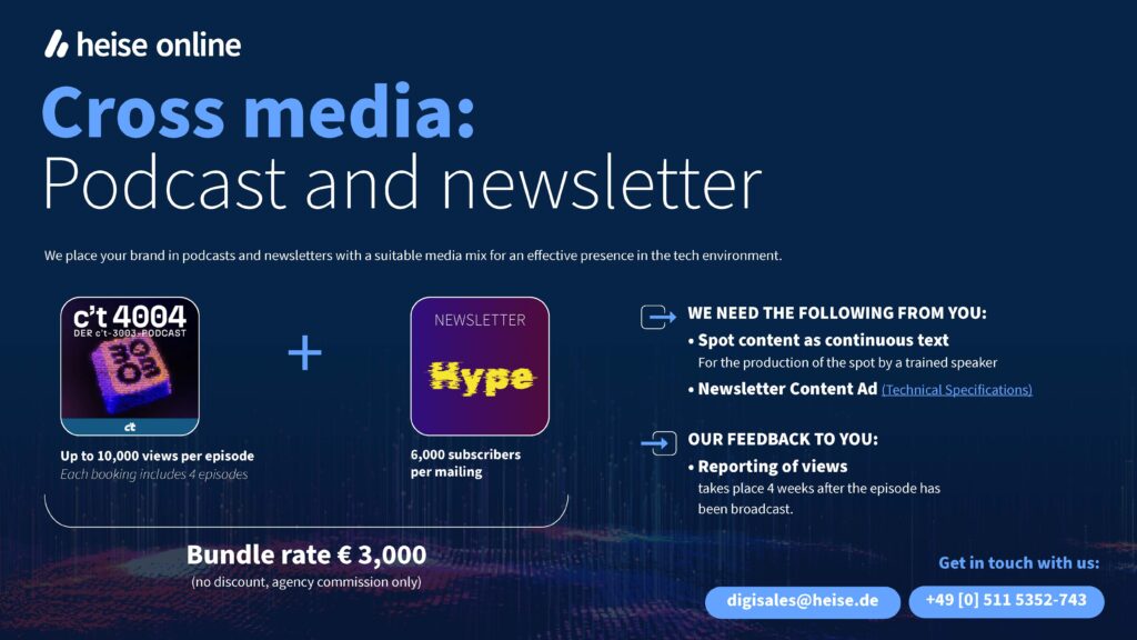 The new podcast The new family member – our c’t 4004 Podcast Benefit from our attractive c’t 4004 bundle and book two focused areas podcast & newsletter in one booking. Contact us and save your offer! More