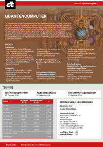 c’t magazin ist das größte IT- und Tech-Magazin Europas. Die Zeitschrift ist eine der verlässlichsten und angesehensten Informationsquellen für alle, die sich für die Entwicklung der IT interessieren – von anspruchsvollen Anwendern und Rechenzentrums-Profis bis zu IT-Führungskräften und Investitionsentscheidern. 245.160 Käufer pro Ausgabe, darunter 142.881 Abonnenten, schätzen das einzigartige Magazin, das für thematische Vielfalt, technisches Know-how, journalistische Unabhängigkeit und gründliche Recherche steht. (IVW III/2025). AWA 2025: Der Erfolg bestätigt die klare Linie und das Konzept.